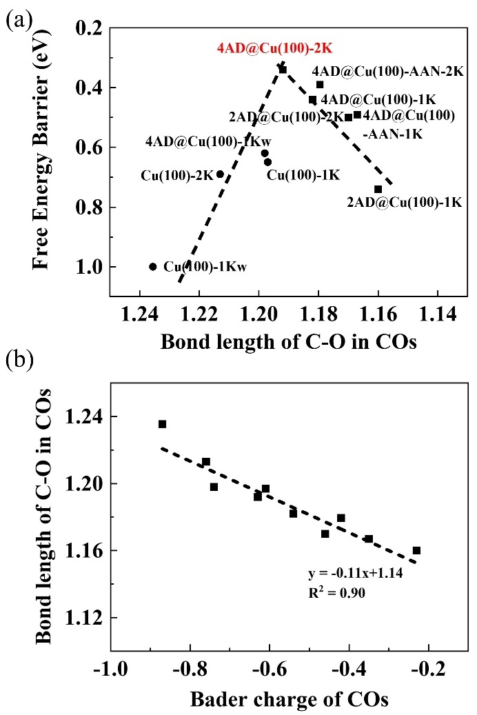 3. 顺利获得对所有研究体系C-O初始键长与CO-CO偶联能垒关系的分析,我们发现C-O键长与自由能垒呈现非单调的关系(类火山曲线),且溶液中含2个K离子的4原子体系CO-CO偶联能垒最低,C-O键长处于最优活化状态。